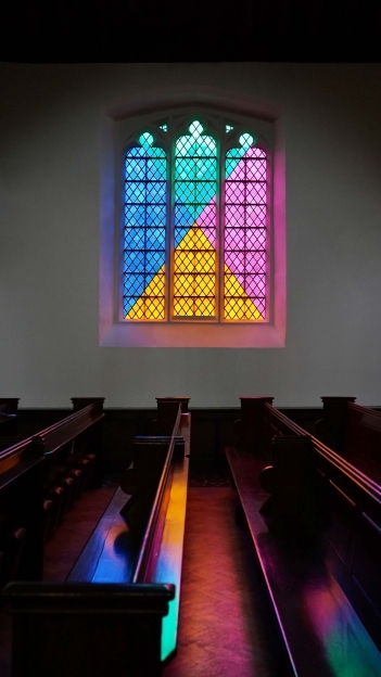 Ritournelle is a site-specific visual and sound installation created at Saint John the Baptist church in the city of Newcastle, England for Platforma Festival 2017. Six of the stain-glass windows of this medieval church have been covered with translucent diamond-shapes coloured vinyl in a series of various patterns. Each combination of colours and geometrical shapes is created in a diaper pattern which refers to traditional crafts from the countries contributing of the highest numbers of migrants in Newcastle: Phulkari textile from Punjabi region, Congolese Kuba clothes, Chinese fabrics, bedecks Syrian carpets, textiles from Rashaida people in Erithrea and mosaic forms from Iraqi and Iranian mosques. In one of the chapter of Thousand Plateus, ‘1837: Of the refrain’, philosophers Gilles Deleuze and Félix Guattari are referring to the ritournelle in terms of spatial territories. Patterns are part of our cultural fabric and stand for national identity or cultural specificities. Ritournelle is about homeland and celebrates through an immersive experience of light and sound a global vision across cultures.